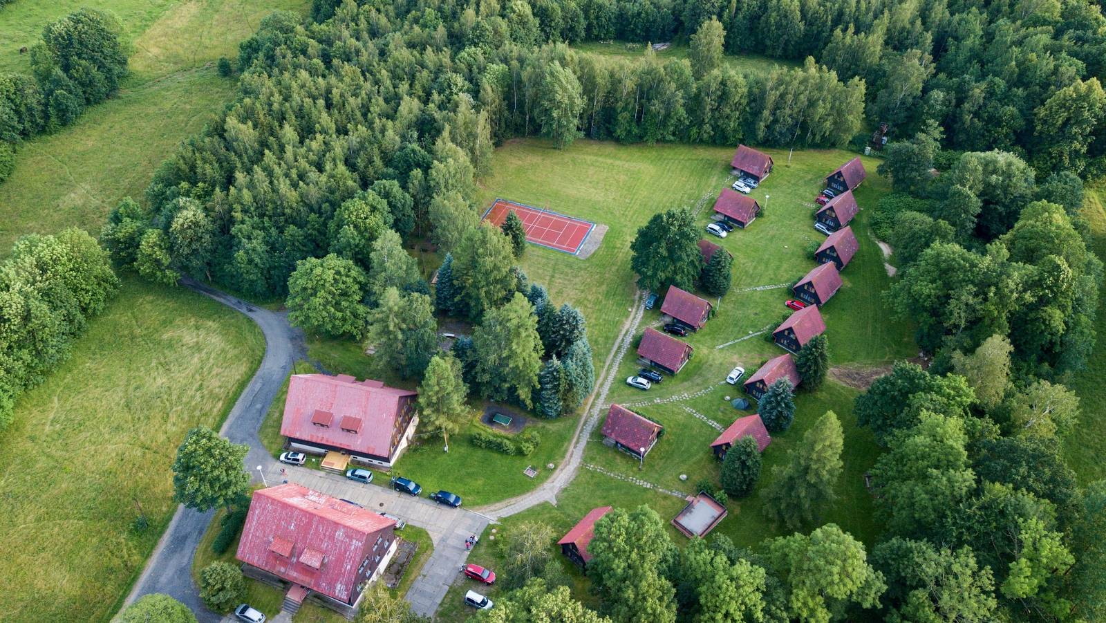 Před vchodem je terasa. Ubytováni budeme v rekreačním středisku, takže nečekejte moderní vybavení a přemíru komfortu, ale připravte se na jednoduché turistické ubytování. Dobrá parta, společné zážitky a vstřícný přístup ubytovatele nám to vynahradí. Součástí areálu je restaurace s předzahrádkou. V areálu je k dispozici společenská místnost, kurt na volejbal s umělým povrchem, dětské hřiště, půjčovna sportovního vybavení, 2 ohniště, parkoviště, wi-fi. 500 m od areálu je obchod a pošta.