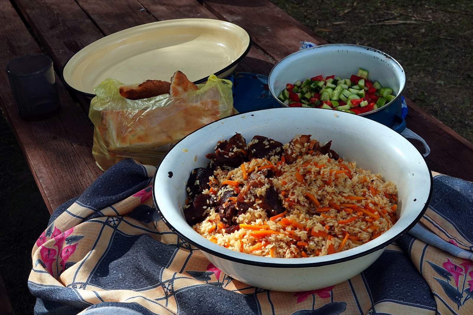 Na treky v horách je třeba mít vlastní stravu, základ na vlastní vaření (lehké, instantní suroviny) i většinu studené stravy je třeba dovézt z ČR, čerstvé potraviny lze dokoupit na místě po příletu. V tábořišti Archa (3 noci) lze sjednat dovoz místní polopenze (doporučeno), v horském kempu Vertical Alaudin (2 noci) je také doporučené využívat místní polopenzi a ochutnat tak, stejně jako poslední dny v Dušanbe, výborná místní jídla - plov, šašlik, manty, laghman, šaurma, šorpo, damlam. K pití se podává lahodný černý a zelený čaj a na své si přijdou i milovníci piva, kteří mohou ochutnat místní piva Sim-Sim, Pulsar a Quibray. Vodu budeme postupně doplňovat. Na vaření s sebou vezměte pouze lehké potraviny s kratší dobou vaření - polévky ze sáčku, jídlo typu Adventure menu, bramborové kaše, sladké kaše, pudink atd. Těžké konzervy neberte! Dále sůl, čaj, cukr. Přes den na túře se nevaří, takže s sebou studené jídlo: kus suchého salámu, tvrdé a měkké sýry, paštiky, džem. Ideální je strava dodávající dostatek energie a přitom lehká, dehydratovaná - müsli, ovesné vločky, čokolády, cereální tyčinky, oplatky, bonbony (lipa, hroznový cukr, ...), sušené ovoce, oříšky a další lehké a vysokoenergetické potraviny. Ve dnech, kdy se nebude stravovat a vařit z dovezených zásob, se budou vaše náklady na jídlo pohybovat kolem 15 USD/den. Vodu budeme postupně doplňovat, doporučujeme si přibalit láhev či camelbag o objemu cca 2 - 2,5 l na osobu, dle vaší osobní denní spotřeby. Nutný je prostředek na dezinfekci pitné vody - tablety či kapky (např. Sanosil - koupíte v lékárnách nebo ve zdravotních ústavech) či případně vodní filtr (např. Sawyer mini filter). Doporučujeme také práškové nápoje a šumivé vitamíny do vody.